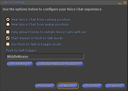 | VoiceChat was implemented from SecondLife version 1.18.1 (2). Firstly it is necessary for you to perform setting to use Voice Chat. |