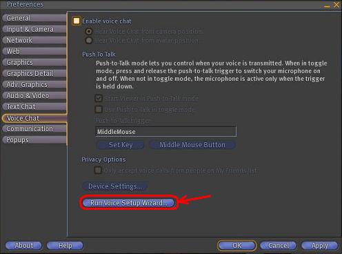 | You choose [Edit] → [Preferences] of the upper menubar. And you choose VoiceChat. "Run Voice Setup Wizard" is this Wizard. |